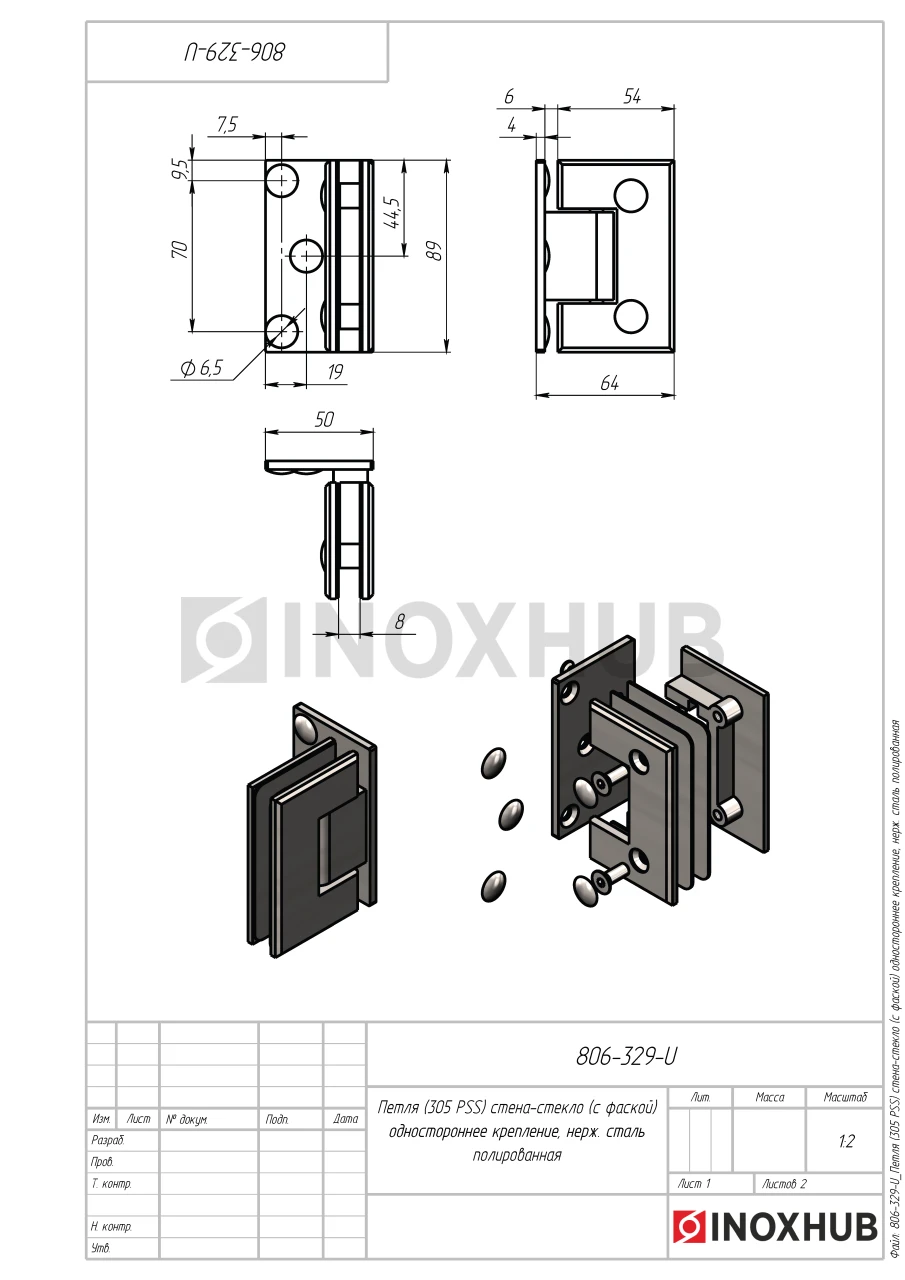 Петля (305 PSS) стена-стекло (c фаской) одностороннее крепление, нерж. сталь полированная