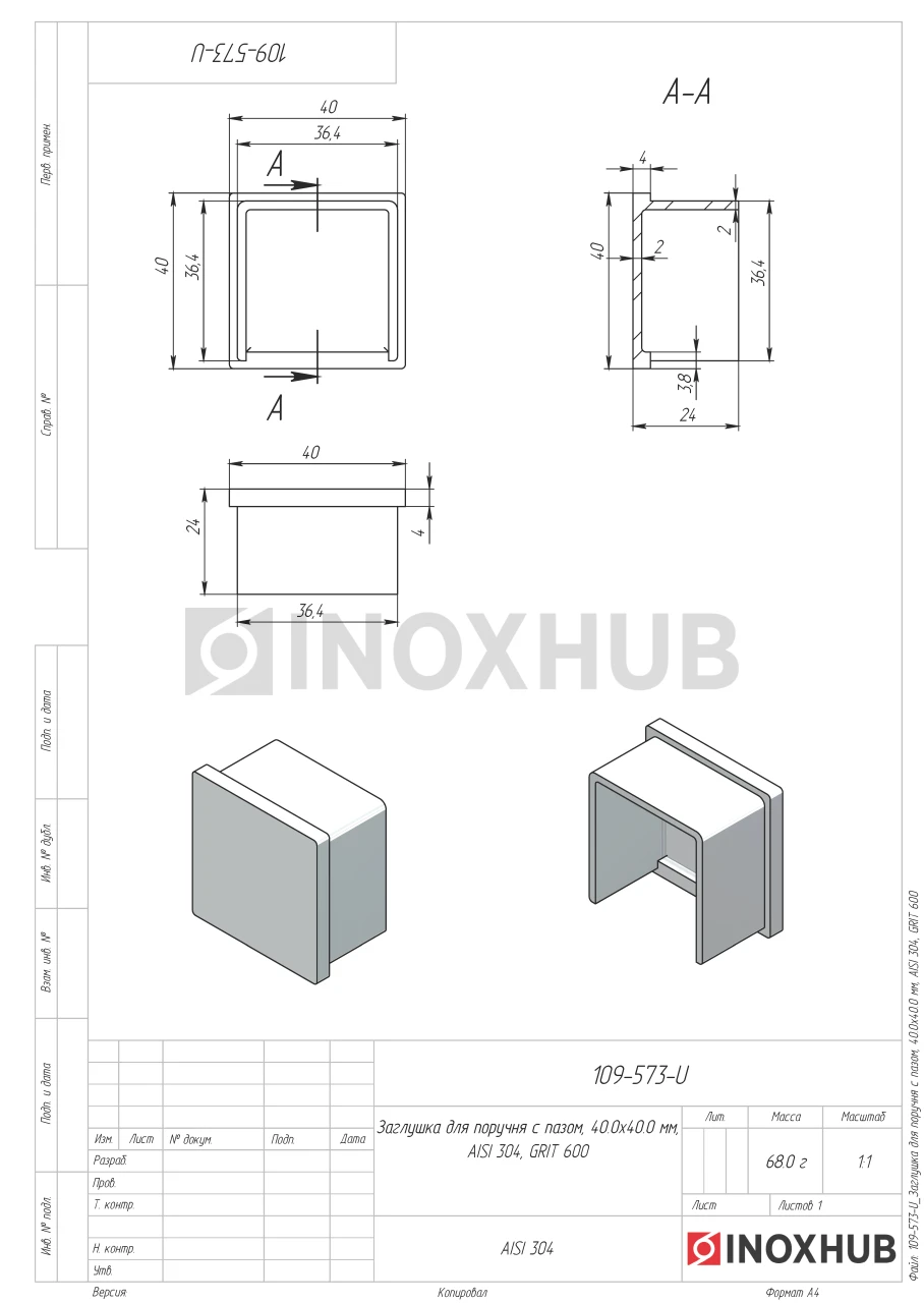 Прямоугольная заглушка для поручня 40х40 мм и пазом для стекла 24х24 мм изготовлена из нержавеющей стали AISI 304. Поверхность полированная — GRIT 600.