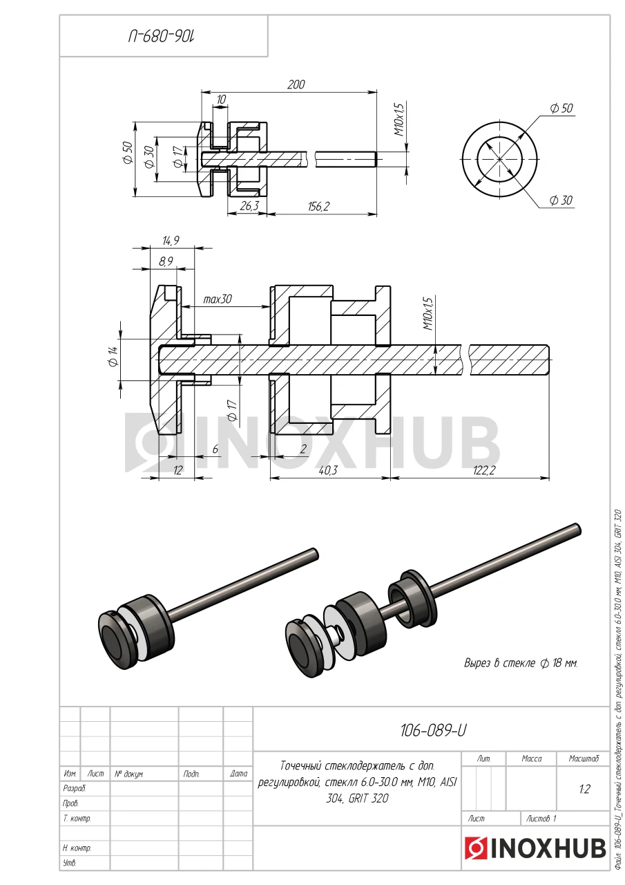 Точечный стеклодержатель с доп. регулировкой, стекло 6.0-30.0 мм, М10, AISI 304, GRIT 320