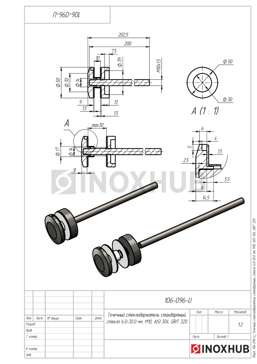 Точечный стеклодержатель с размером шпильки М10 подходит для стекол толщиной 6-30 мм. Шайбы изготовлены из стали марки AISI 304, поэтому деталь можно эксплуатировать на улице. Длинная оцинкованная шпилька выдерживает большую массу стекла. Длина шпильки — 200 мм, диаметр шайб — 50 мм. Поверхность шлифованная GRIT 320.