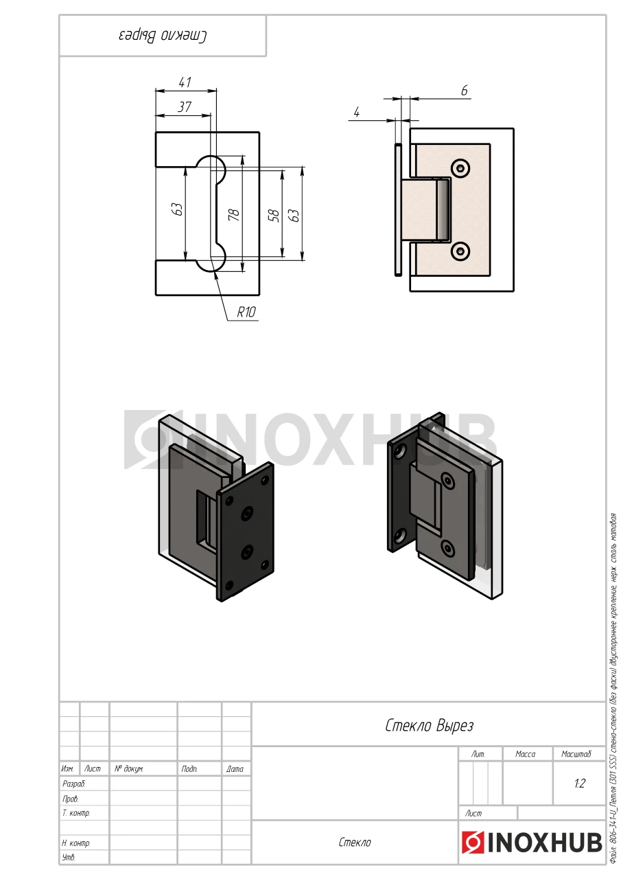 Сборка и монтаж. Перед установкой необходимо подготовить стекло и собрать петлю согласно чертежам и схемам. В комплекте поставляются прокладки для прочной фиксации стеклопанели. Стекло зажимается между пластинами петли, которые соединяются двумя шестигранными болтами. Установочная площадка крепится на 4 болта к стене с двух сторон, поэтому нагрузка распределяется равномерно, петли не выгибаются.