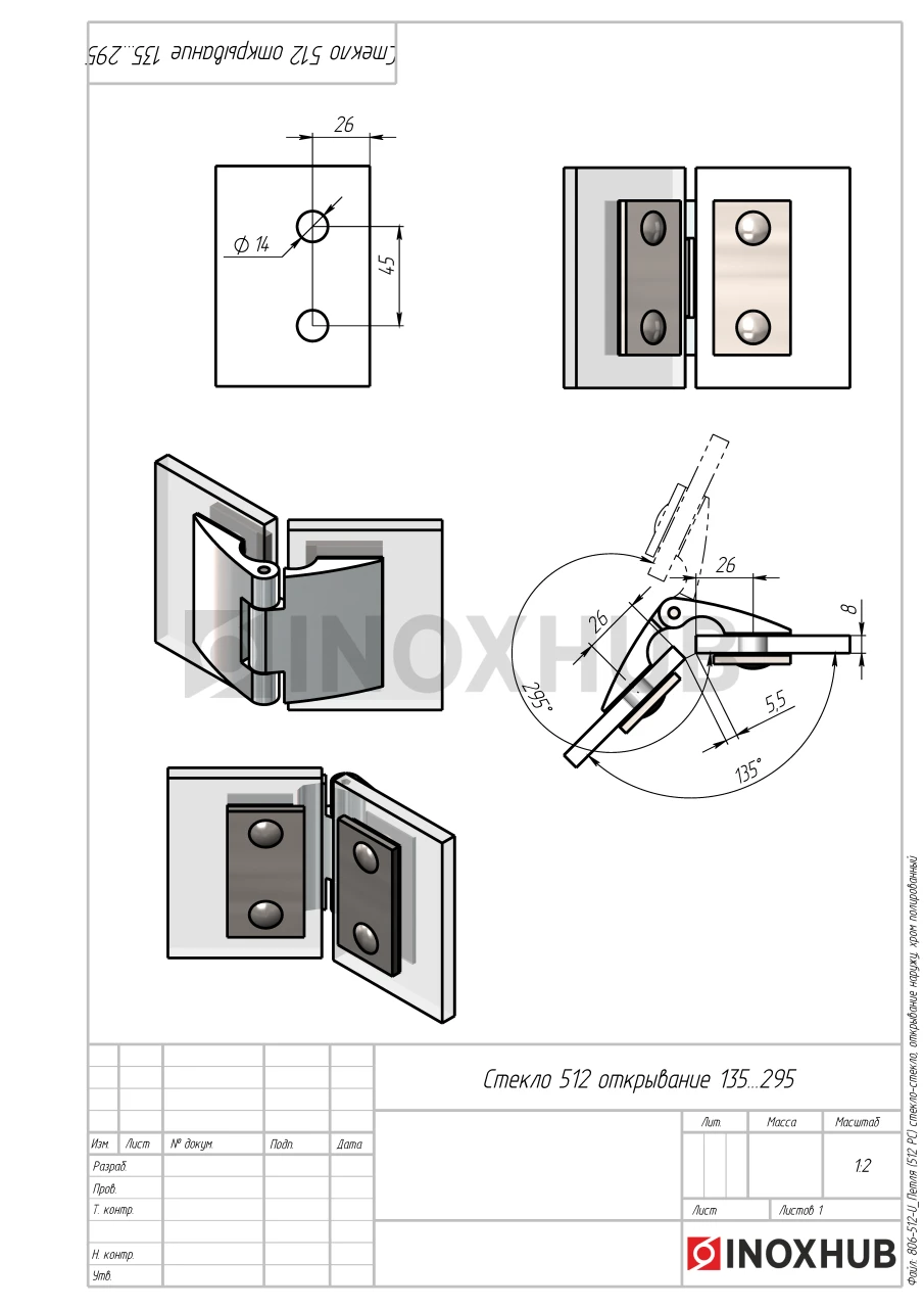 Сборка и монтаж. Подготовьте отверстия в стекле и двери согласно чертежу. Петля не требует реза уплотнителя, все крепежные элементы поставляются в комплекте. Модель устанавливается на шестигранные винты.