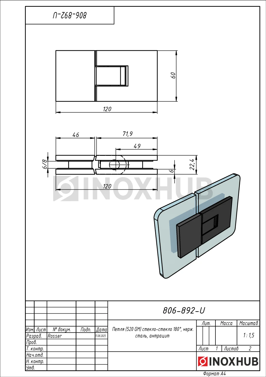 Петля (520 GM) стекло-стекло 180°, нерж. сталь, антрацит