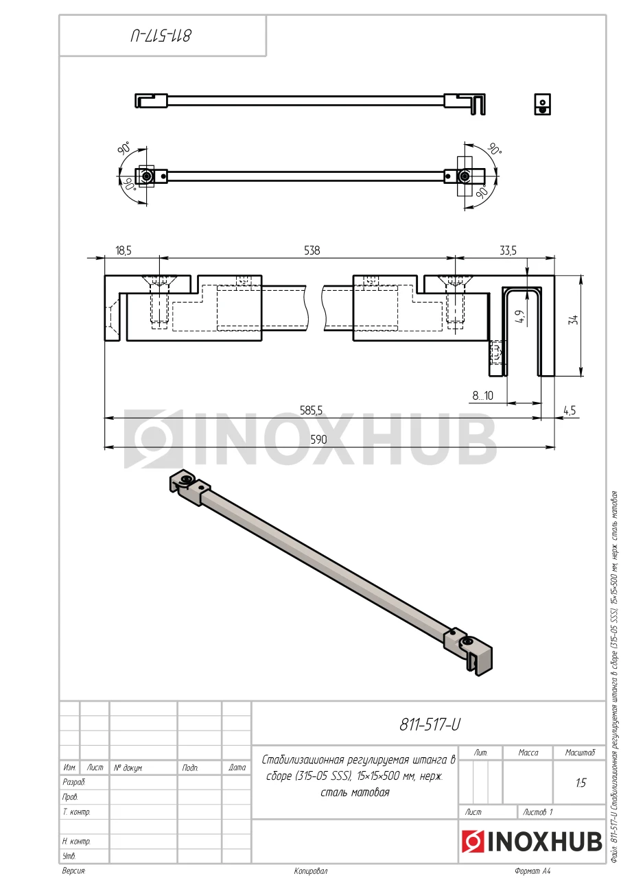 Стабилизационная регулируемая штанга в сборе (315-05 SSS), 15×15×500 мм, нерж. сталь матовая