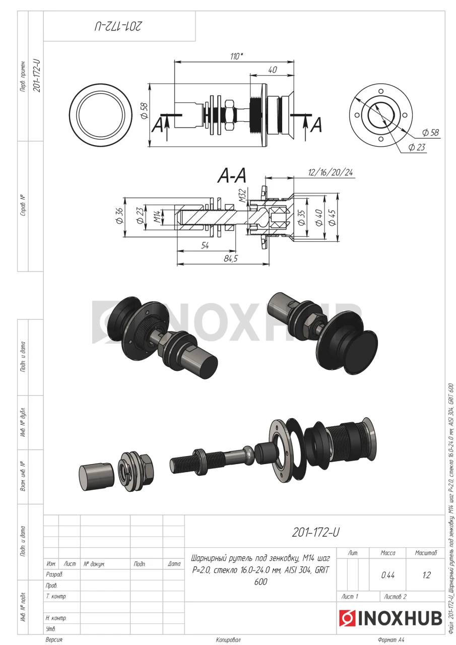 Шарнирный рутель под зенковку, М14 шаг Р=2, стекло 16.0-24.0 мм, AISI 304, GRIT 320