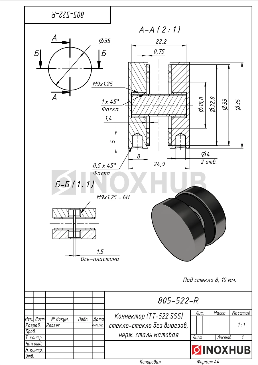 Коннектор (ТТ-522 SSS) стекло-стекло без вырезов, нерж. сталь матовая