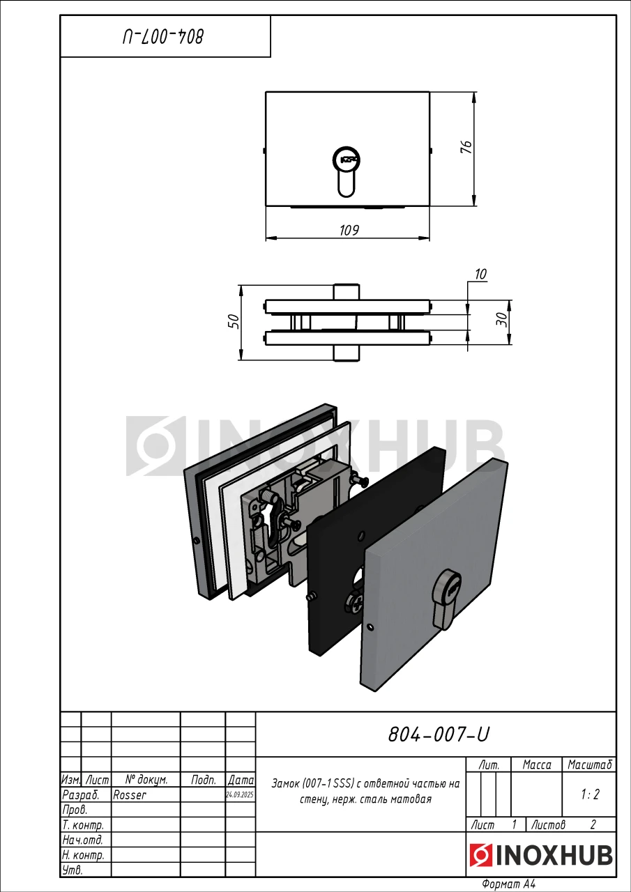 Замок (007-1 SSS) с ответной частью на стену, нерж. сталь матовая
