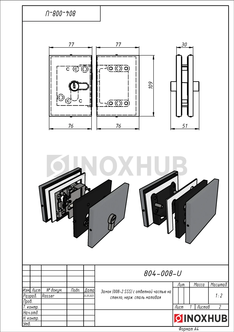Замок (007-2 SSS) с ответной частью на стекло, нерж. сталь матовая