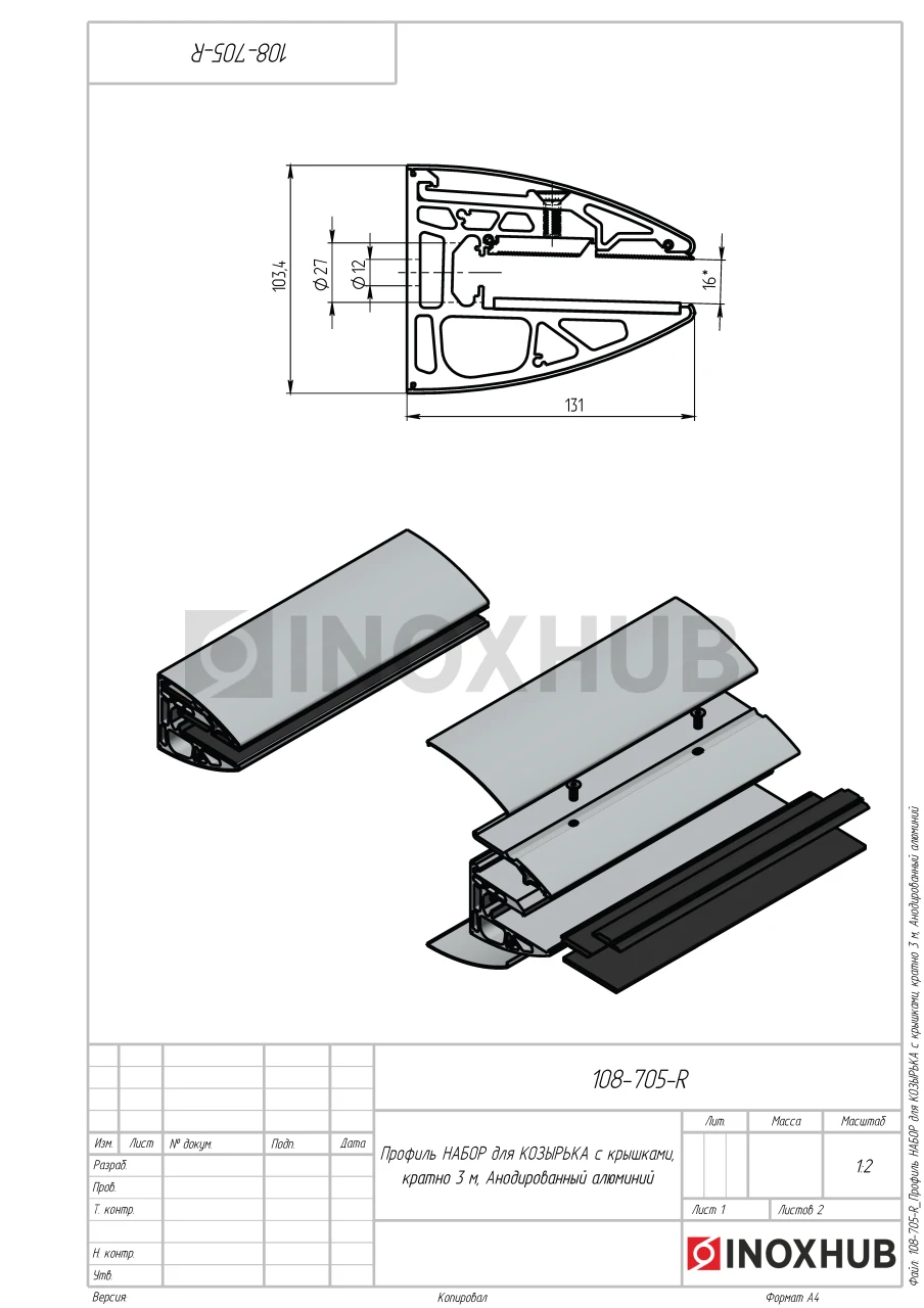 Профиль НАБОР для КОЗЫРЬКА с крышками, кратно 3 м, Анодированный алюминий