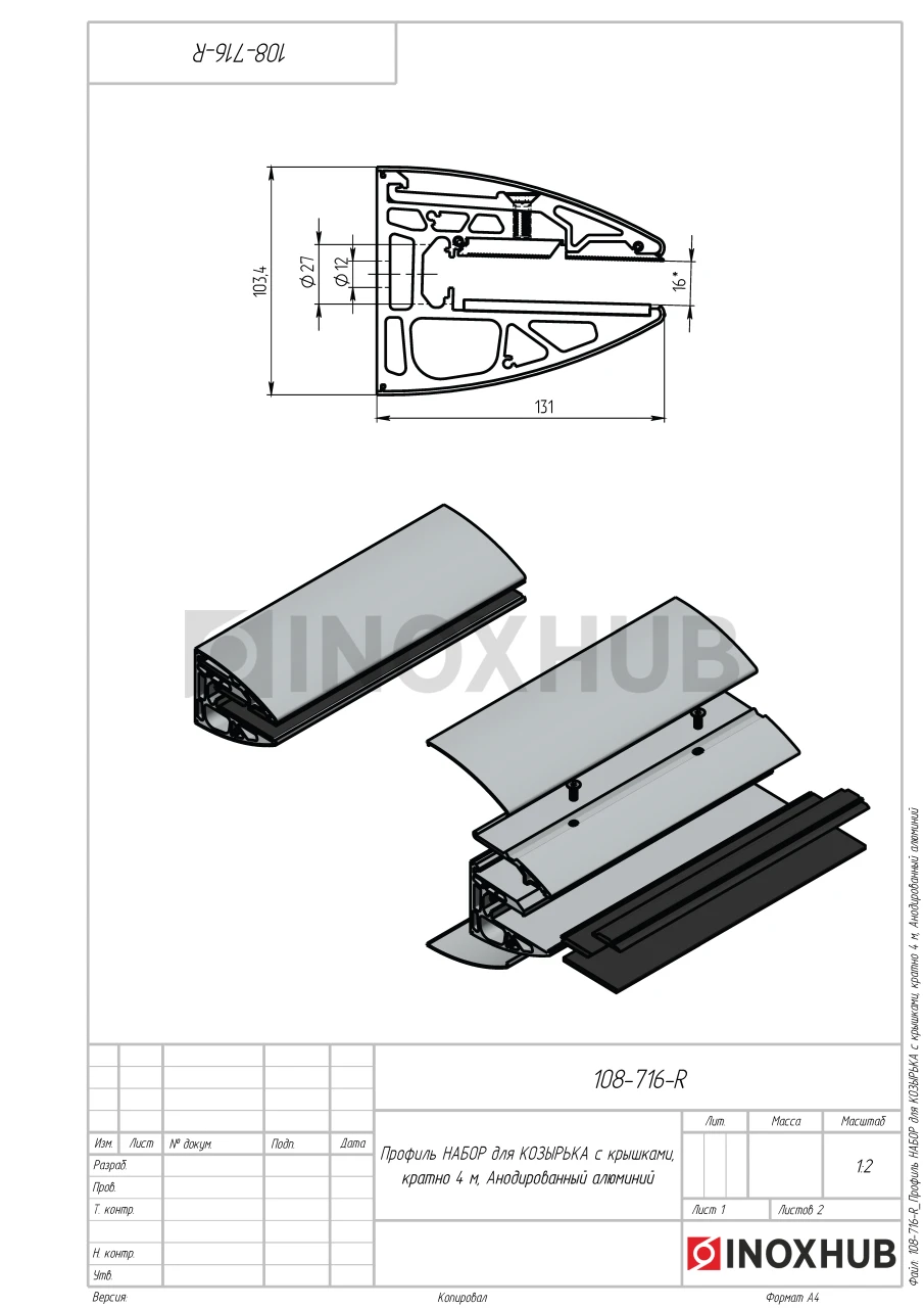 Профиль НАБОР для КОЗЫРЬКА с крышками, кратно 4 м, Анодированный алюминий