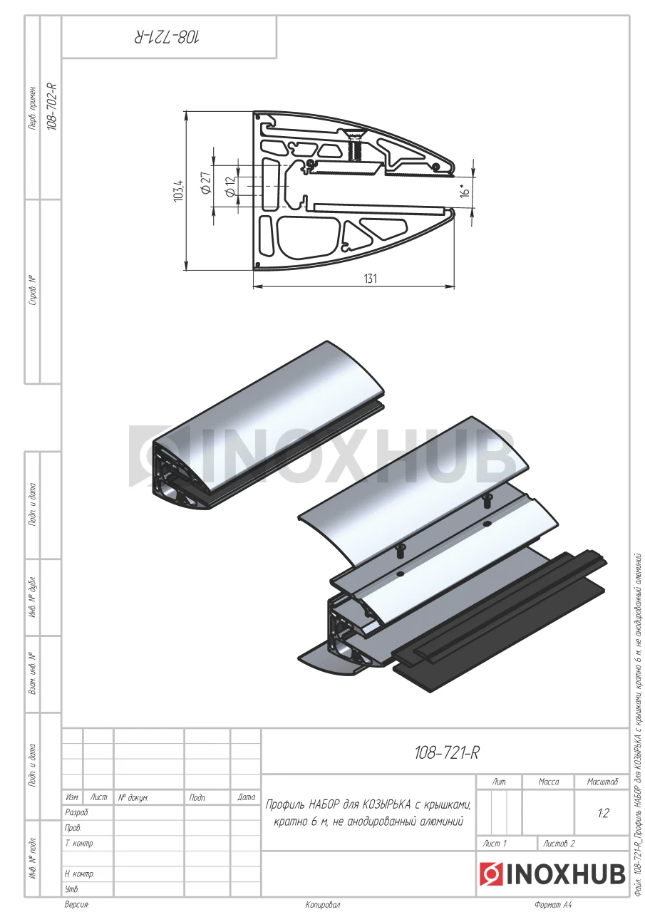 Профиль НАБОР для КОЗЫРЬКА с крышками, кратно 6 м, не анодированный алюминий