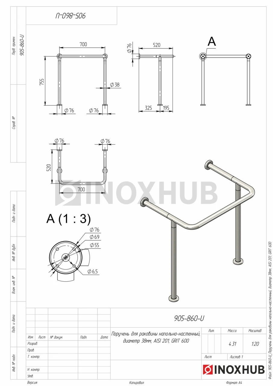 Поручень для раковины напольно-настенный, Ø38 мм, AISI 201, GRIT 600