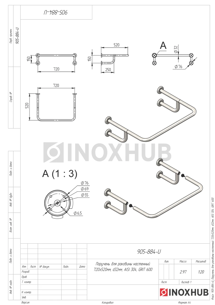 Поручень для раковины настенный, 720×520 мм, Ø32 мм, AISI 304, GRIT 600
