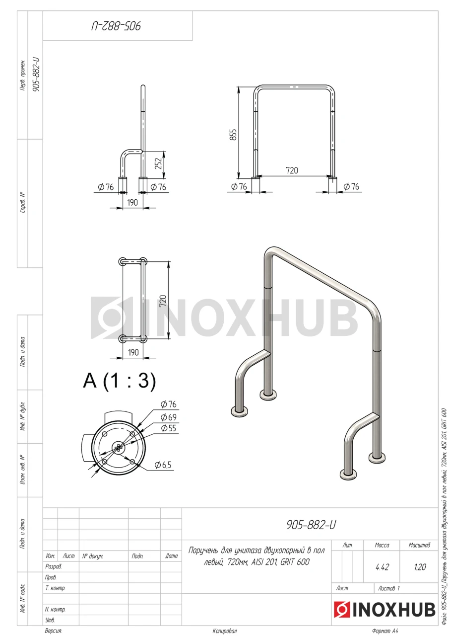 Поручень двухопорный в пол, 720 мм, Ø38 мм, AISI 201, GRIT 600
