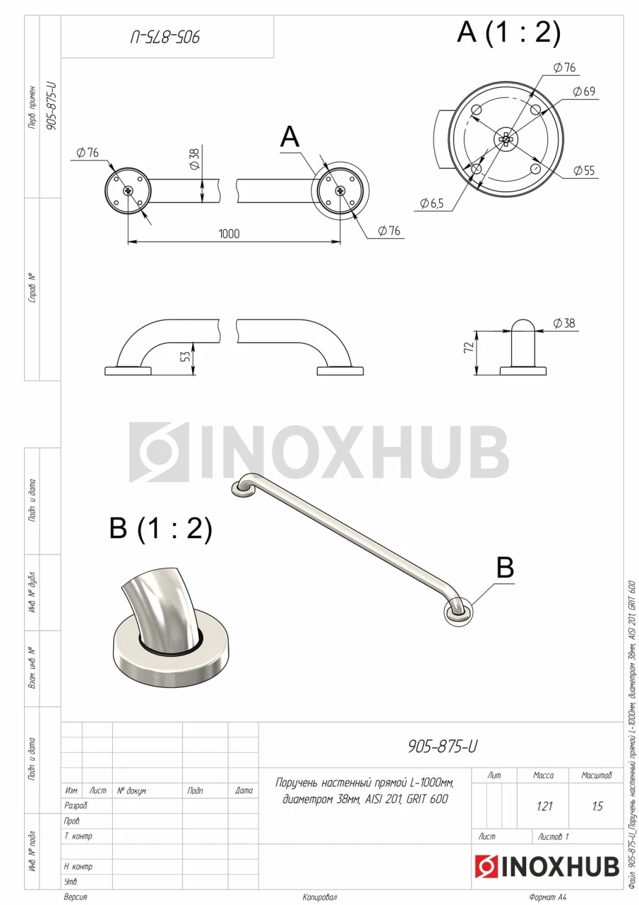 Поручень настенный прямой, L=1000 мм, Ø38 мм, AISI 201, GRIT 600