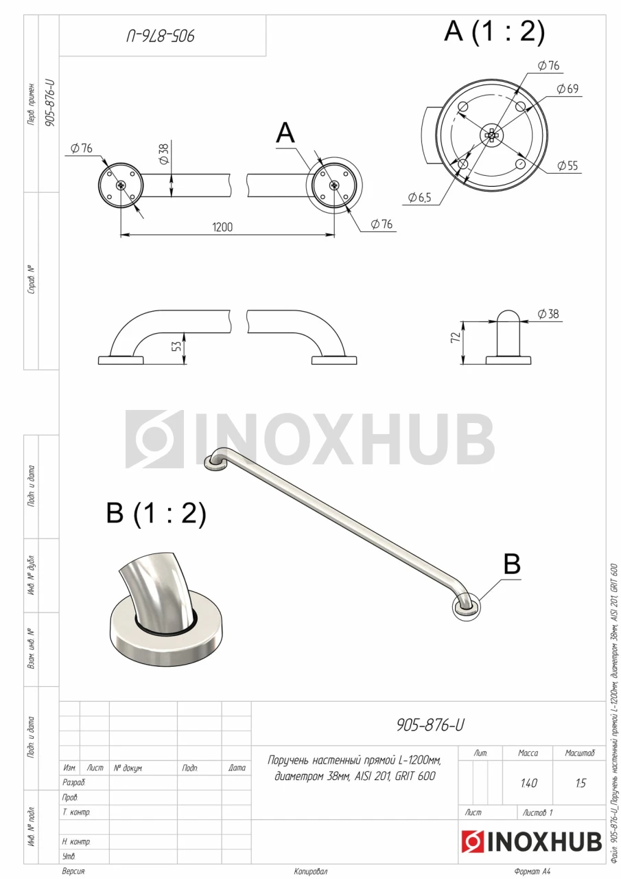 Поручень настенный прямой, L=1200 мм, Ø38 мм, AISI 201, GRIT 600