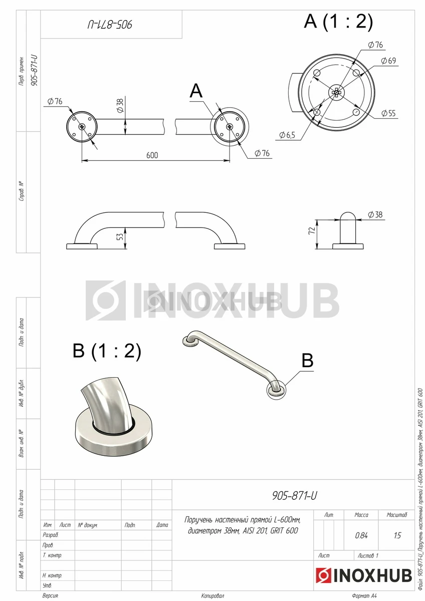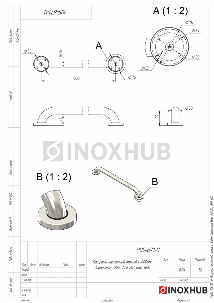Поручень настенный прямой, L=600 мм, Ø38 мм, AISI 201, GRIT 600