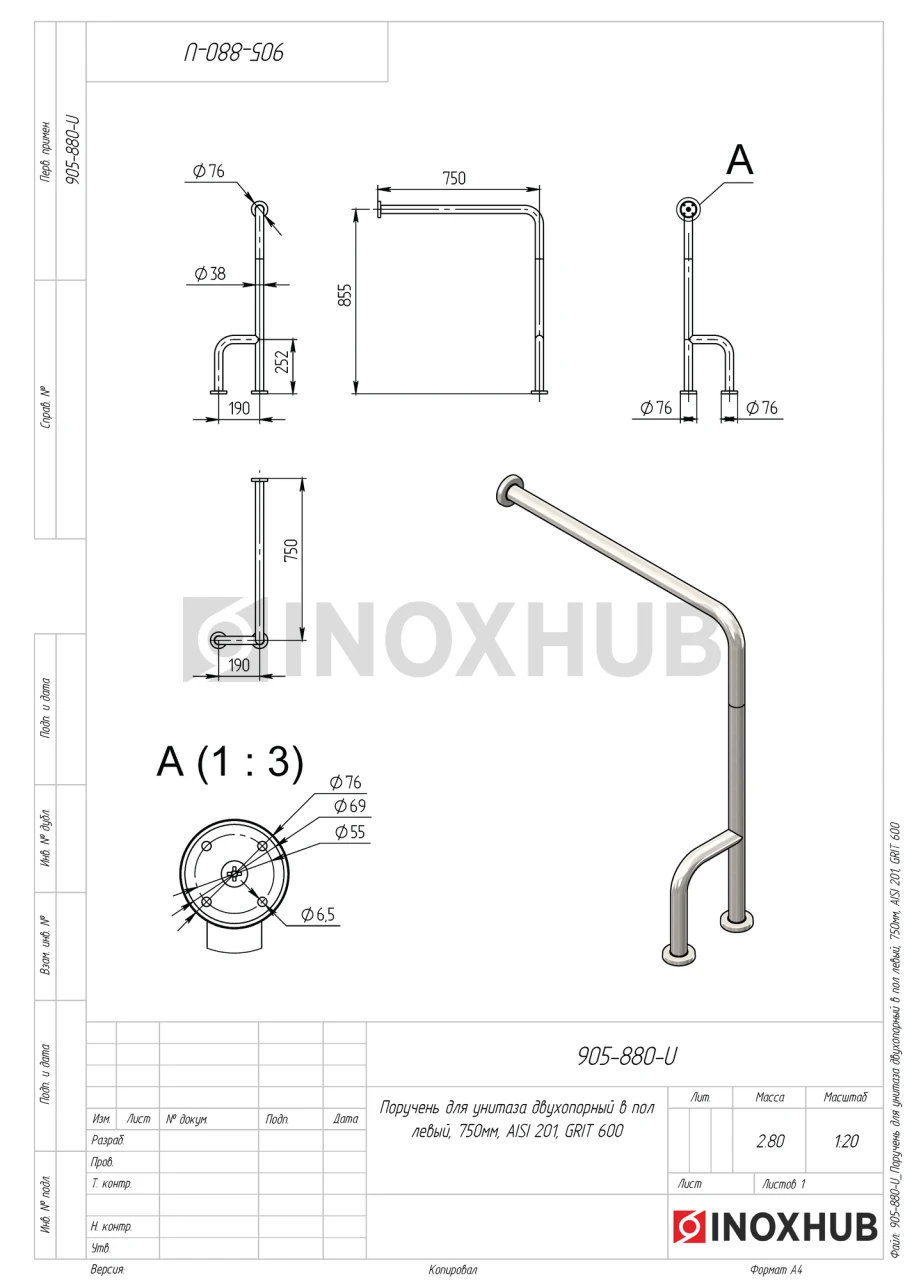 Поручень одноопорный в пол левый, Ø38 мм, AISI 201, GRIT 600