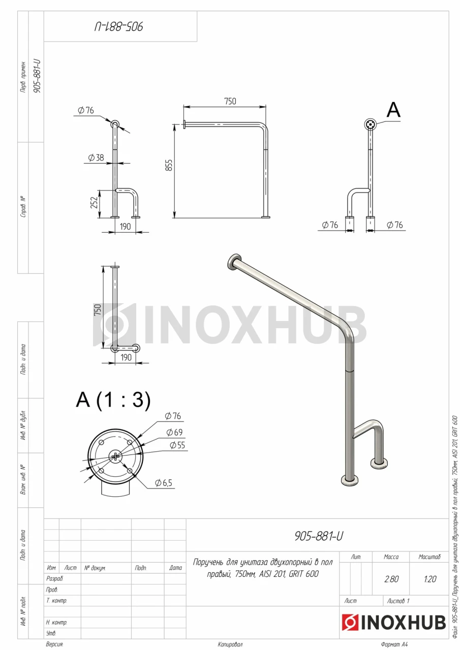 Поручень одноопорный в пол правый, Ø38 мм, AISI 201, GRIT 600