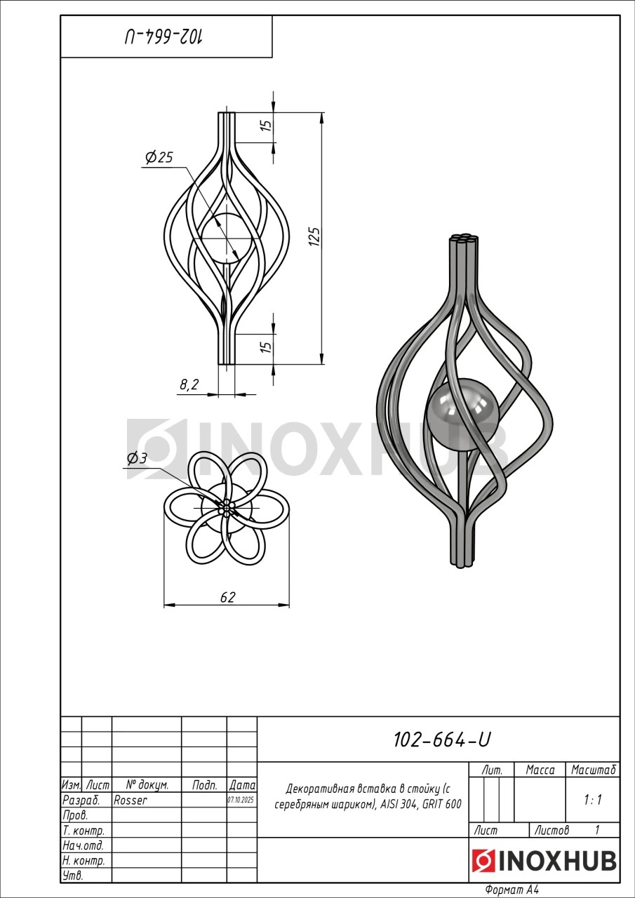 Декоративная вставка в стойку (с серебряным шариком), AISI 304, GRIT 600