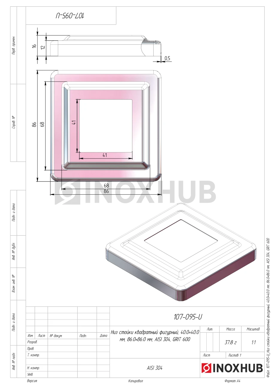 Низ стойки квадратный фигурный, 40.0×40.0 мм / 86.0×86.0 мм, AISI 304, GRIT 600