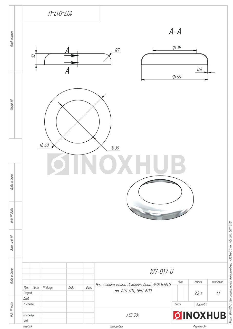 Низ стойки малый декоративный, Ø38.1×60.0 мм, AISI 304, GRIT 600