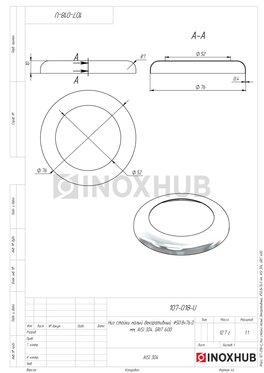 Декоративный низ стойки диаметром 76 мм. Выполнен из стали AISI 304. Имеет поверхность GRIT 600 — полированную.