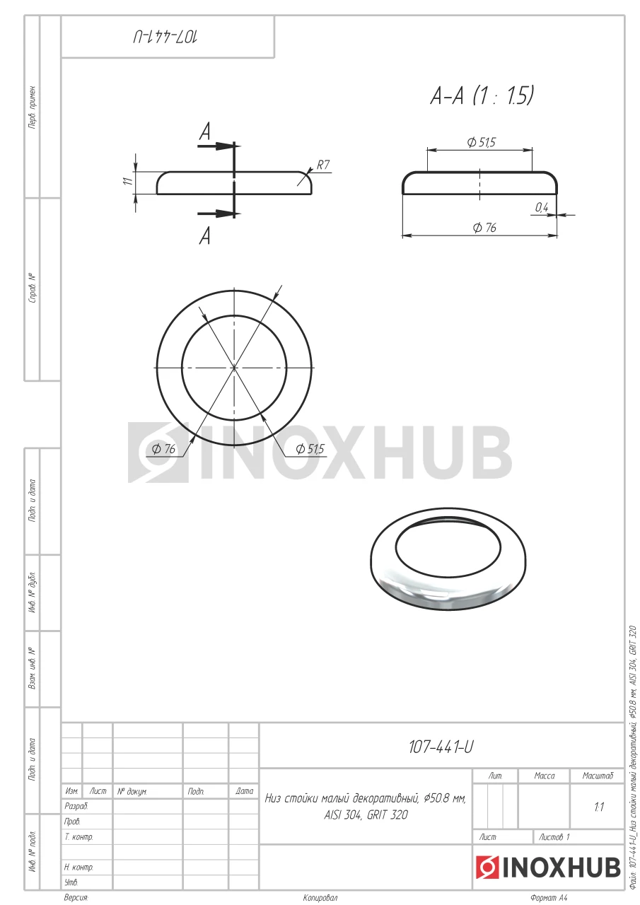 Низ стойки малый из нержавеющей стали марки AISI 304 подходит для установки на улице и в помещении. Деталь нанизывается на трубу диаметром 50,8 мм. Диаметр изделия — 76 мм. Поверхность шлифованная — GRIT 320.