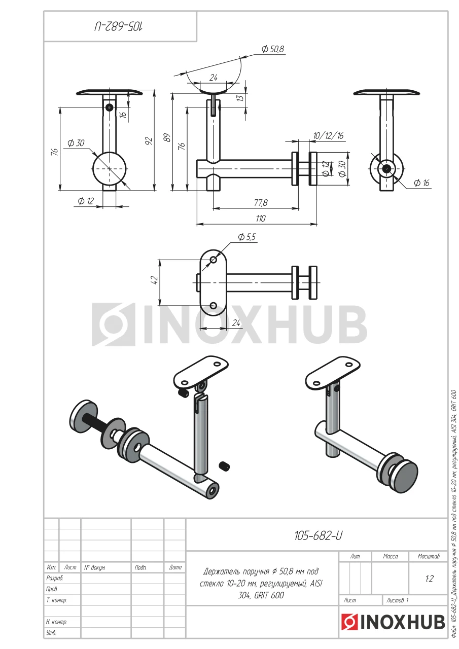 Держатель поручня Ø50.8 мм, стекло 10.0-20.0 мм, регулируемый, AISI 304, GRIT 600
