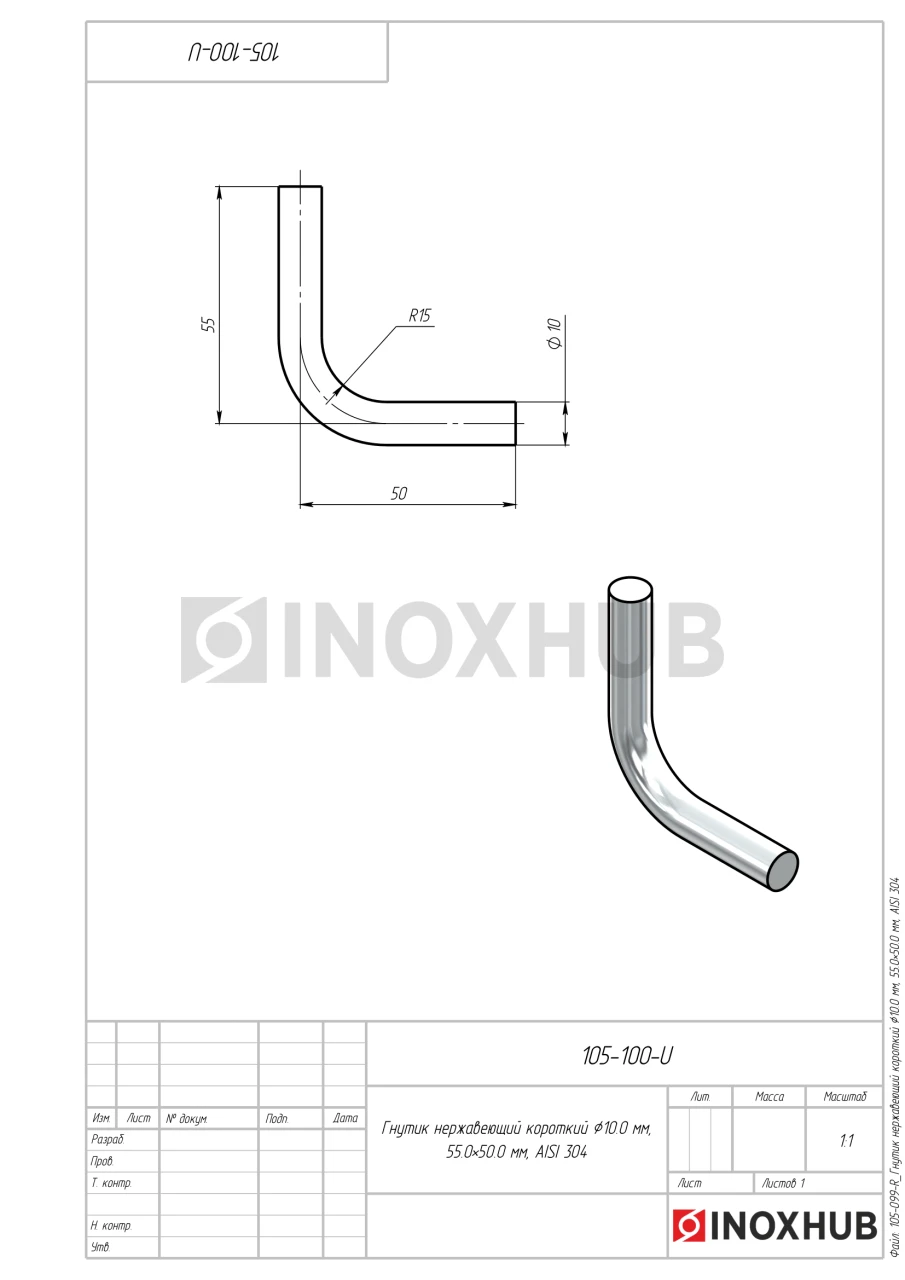 Гнутик нержавеющий короткий Ø10.0 мм, 55.0×50.0 мм, AISI 304