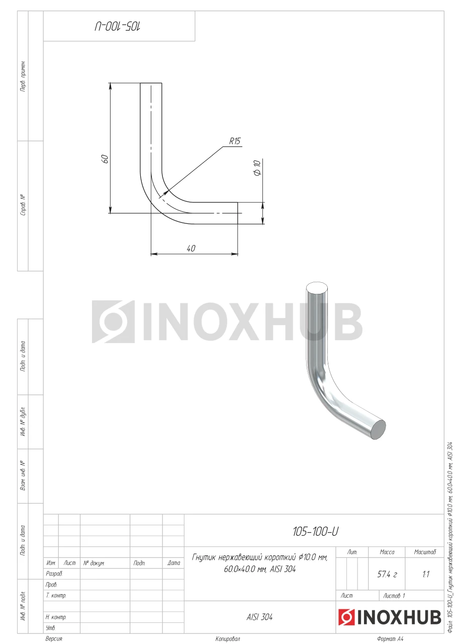 Гнутик нержавеющий короткий Ø10.0 мм, 60.0×40.0 мм, AISI 304