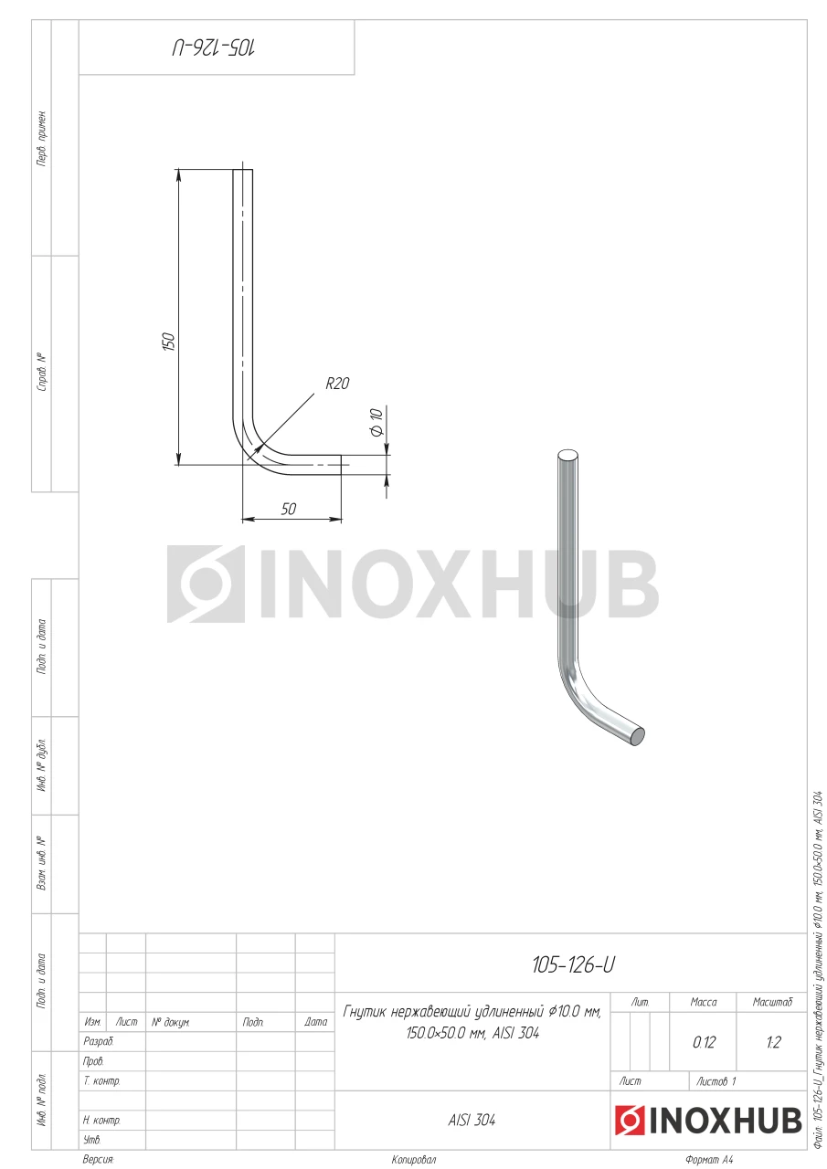 Гнутик нержавеющий удлиненный Ø10.0 мм, 150.0×50.0 мм, AISI 304