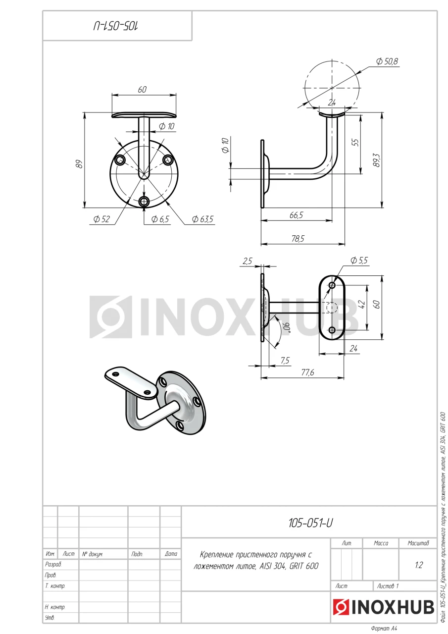 Крепление пристенного поручня с ложементом (Ø50.8), AISI 304, GRIT 600