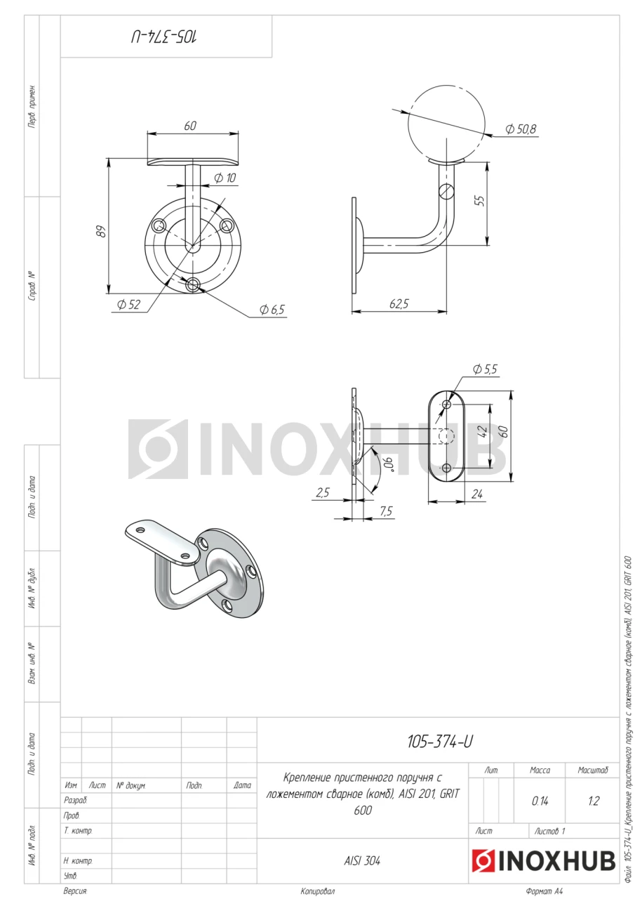 Крепление пристенного поручня с ложементом (Ø50.8) сварное (комб), AISI 201, GRIT 600