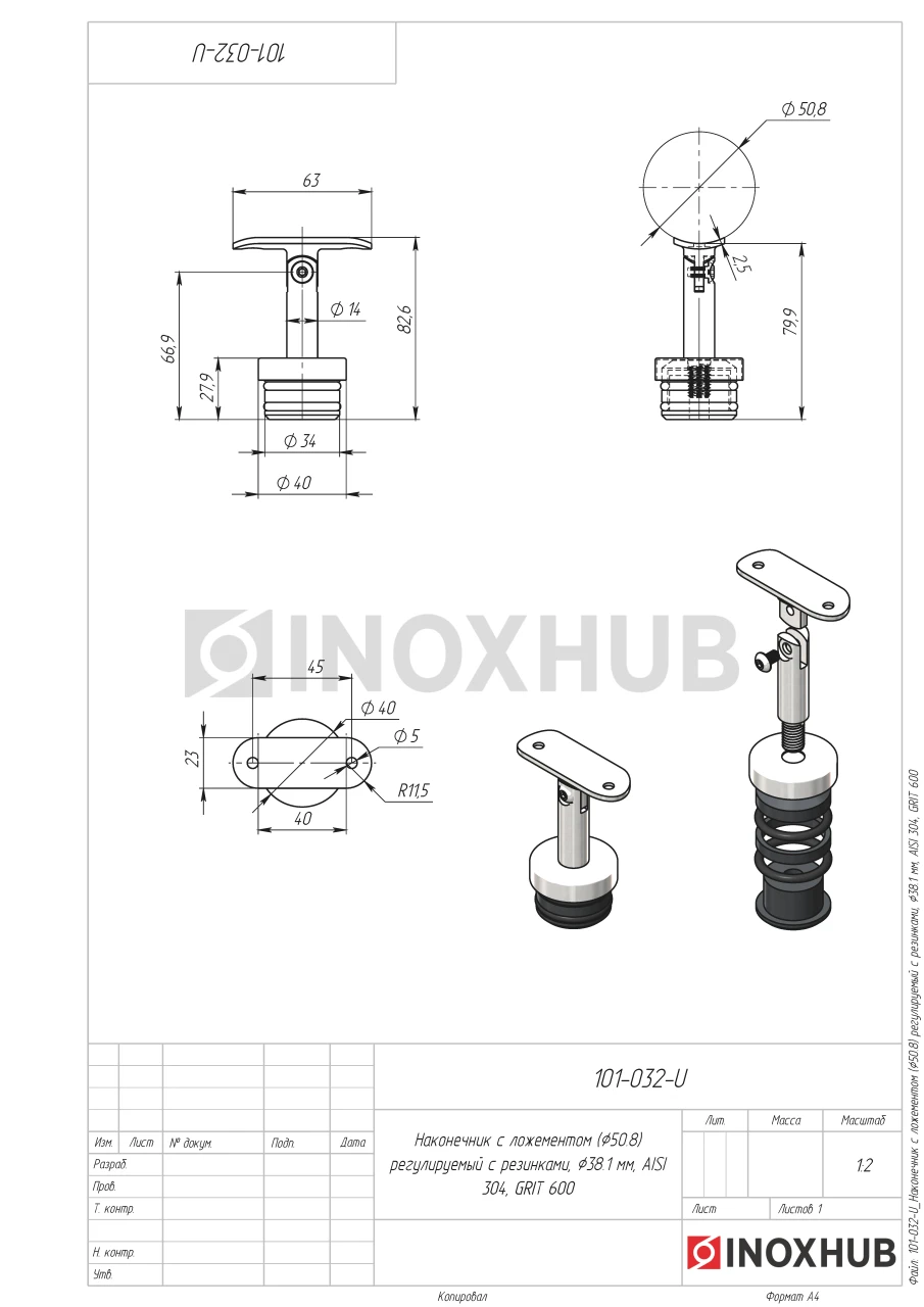 Наконечник с ложементом (Ø50.8) регулируемый с резинками, Ø38.1 мм, AISI 304, GRIT 600