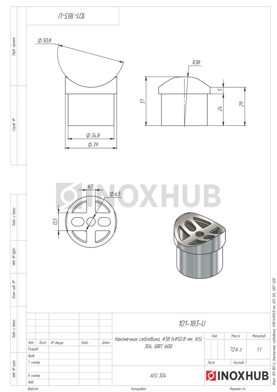 Наконечник седловина, Ø38.1ר50.8 мм, AISI 304, GRIT 600