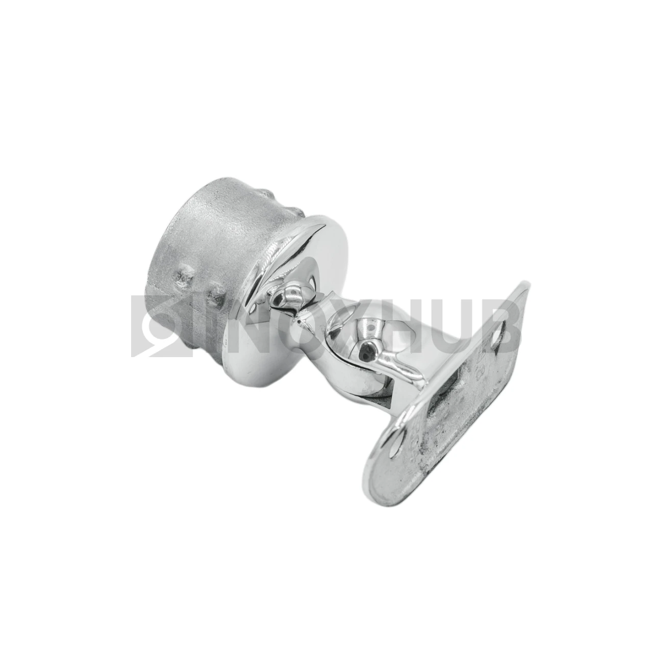 Наконечник шаровой с настраиваемым ложементом. За счет шарнира удается менять угол наклона ложа. Это делает изделие универсальным. Его можно использовать для установки на прямом участке ограждения, а также на лестницах. Материал — нержавеющая сталь AISI 304 — подходит для уличного применения.