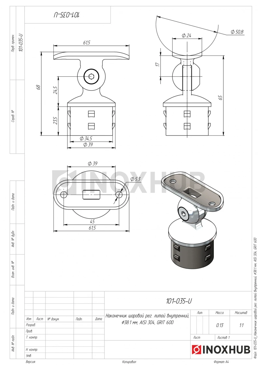 Наконечник шаровой рег. литой внутренний, Ø38.1 мм, AISI 304, GRIT 600