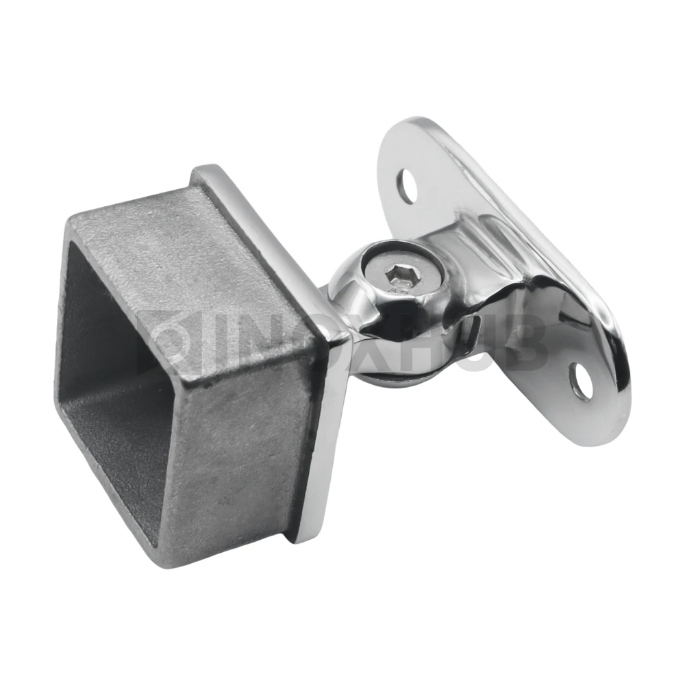 Шаровой наконечник с регулируемым углом. Выполнен из стали AISI 304. Полированная поверхность GRIT 600. Размер стойки составляет 40×40 мм. Ложемент предназначен под плоскость. Допустим любой размер поручня.