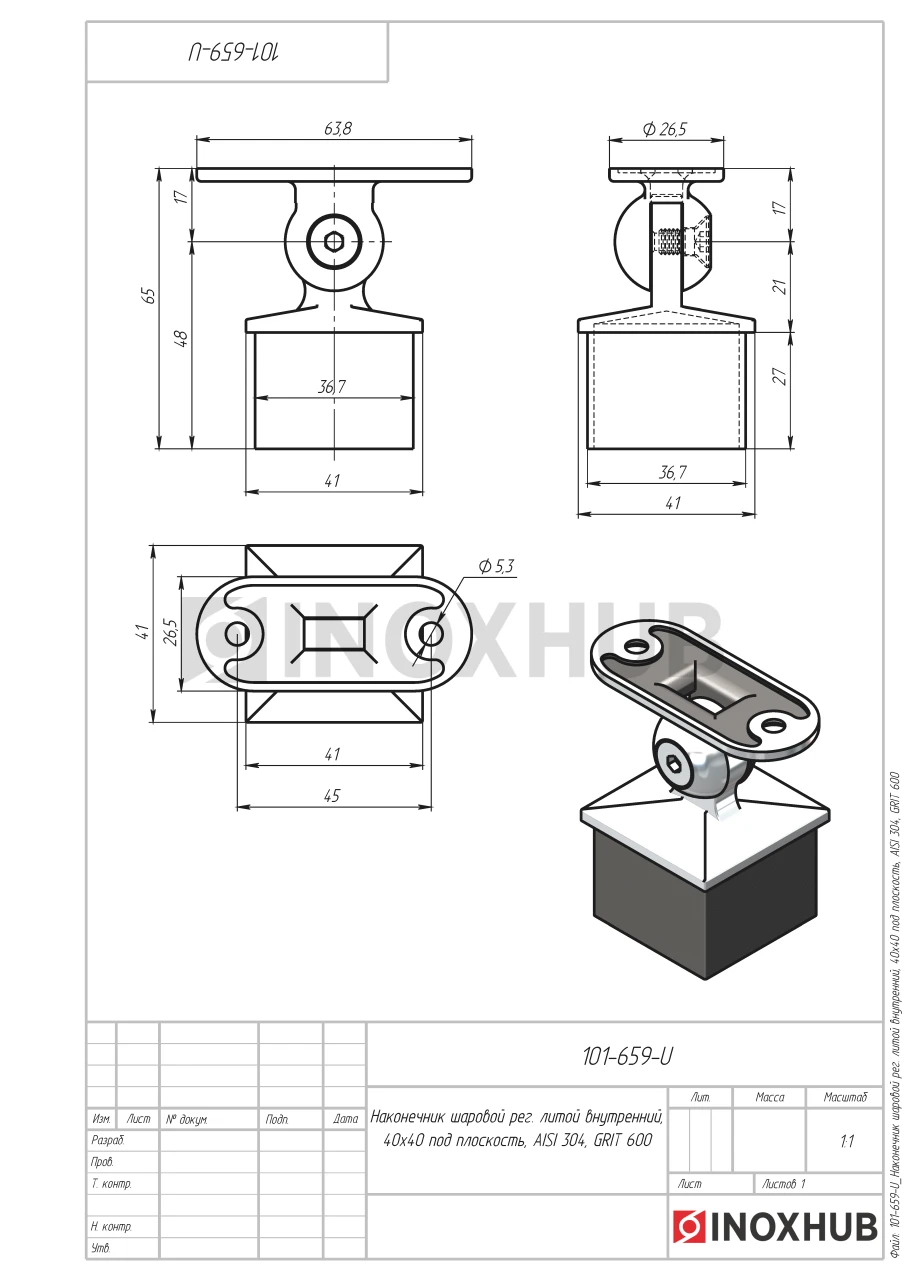 Наконечник шаровой рег. литой внутренний под плоскость, 40×40 мм, AISI 304, GRIT 600
