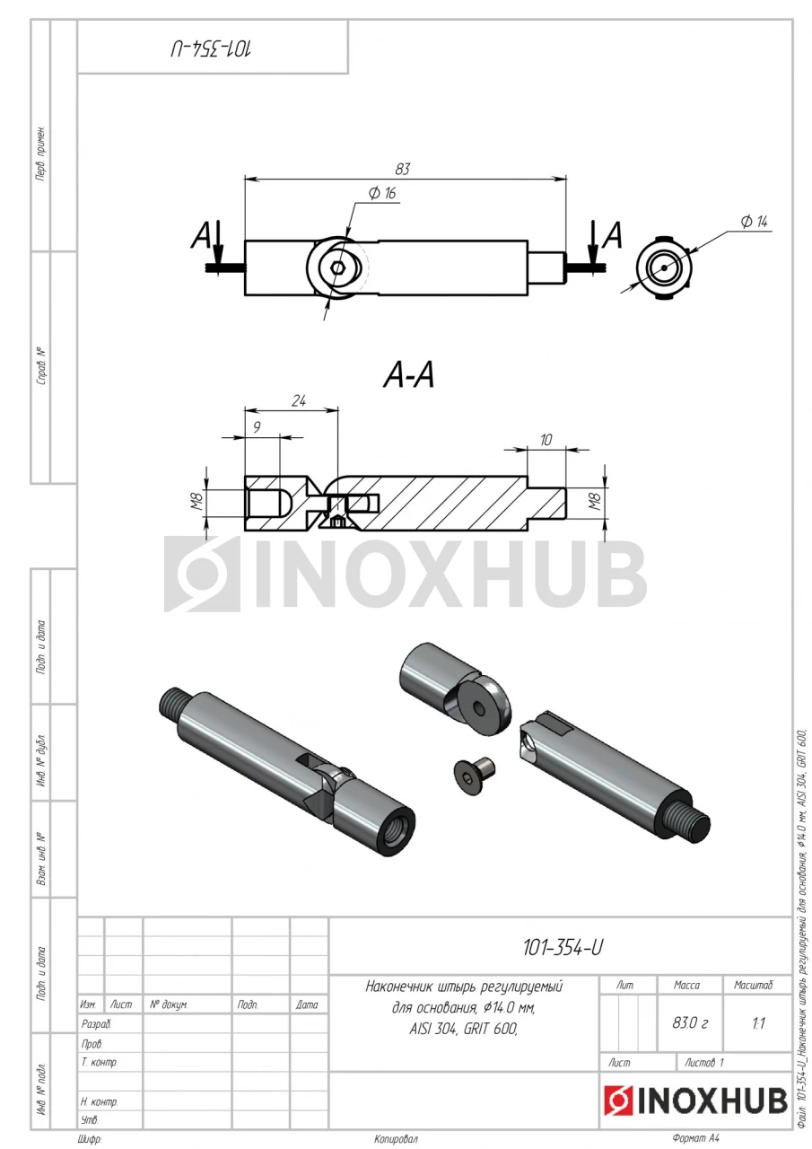 Наконечник штырь регулируемый. Предназначен для основания. Изготовлен из стали AISI 304. Полированная GRIT 600 поверхность. Подходит для лестничных маршей, а также горизонтальных поверхностей.