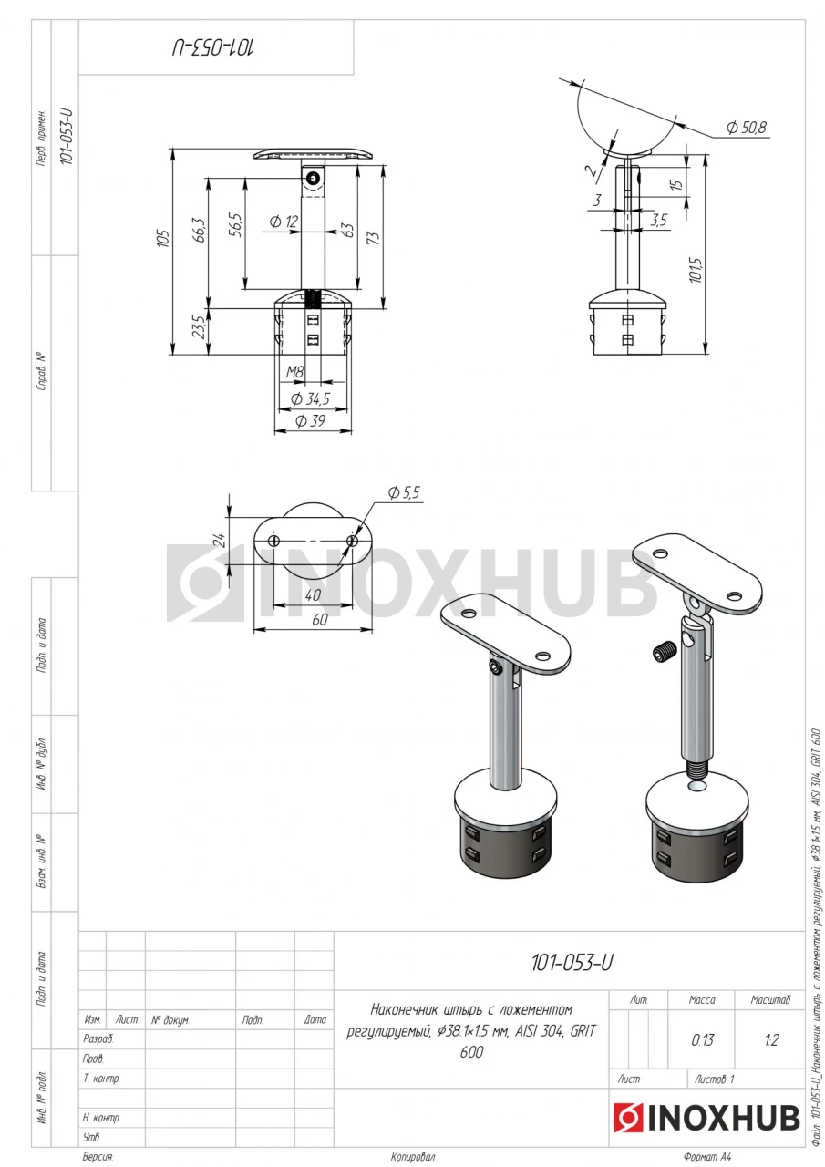 Наконечник штырь с ложементом (Ø50.8) регулируемый, Ø38.1×1.5 мм, AISI 304, GRIT 600