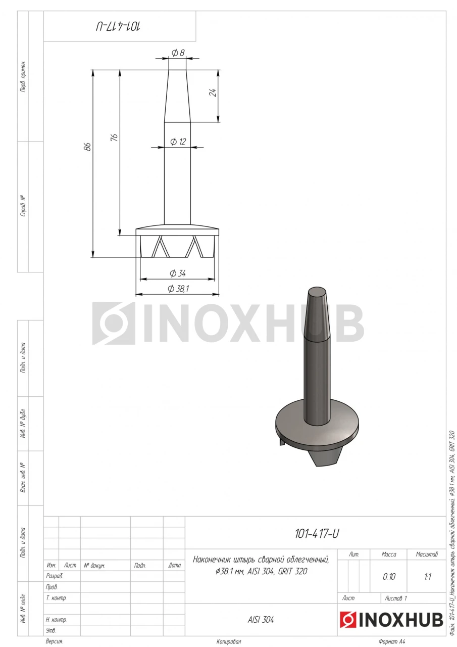 Наконечник штырь сварной облегченный, Ø38.1 мм, AISI 304, GRIT 320