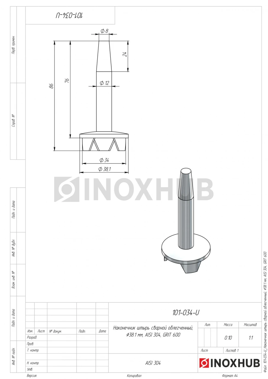 Наконечник штырь сварной облегченный, Ø38.1 мм, AISI 304, GRIT 600