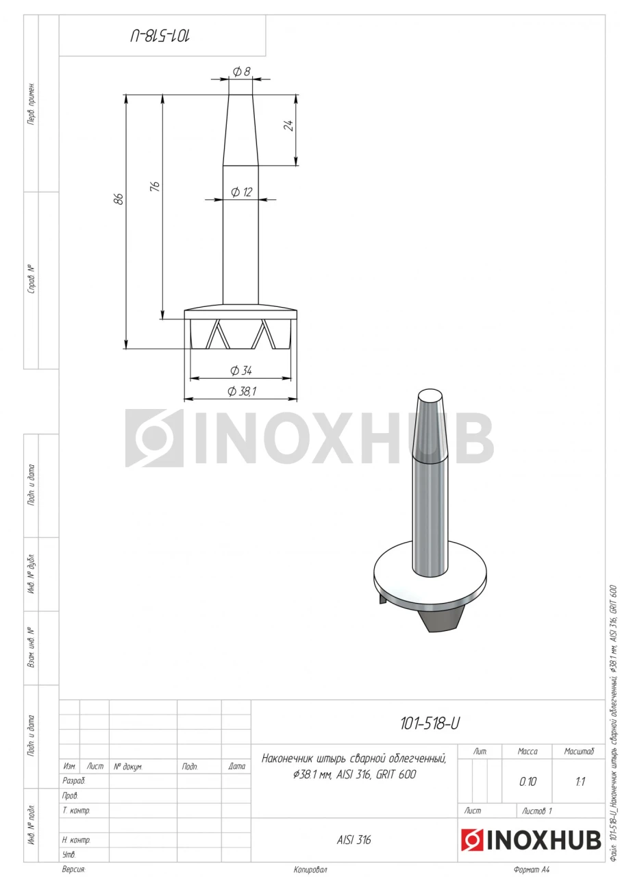 Наконечник штырь сварной облегченный, Ø38.1 мм, AISI 316, GRIT 600