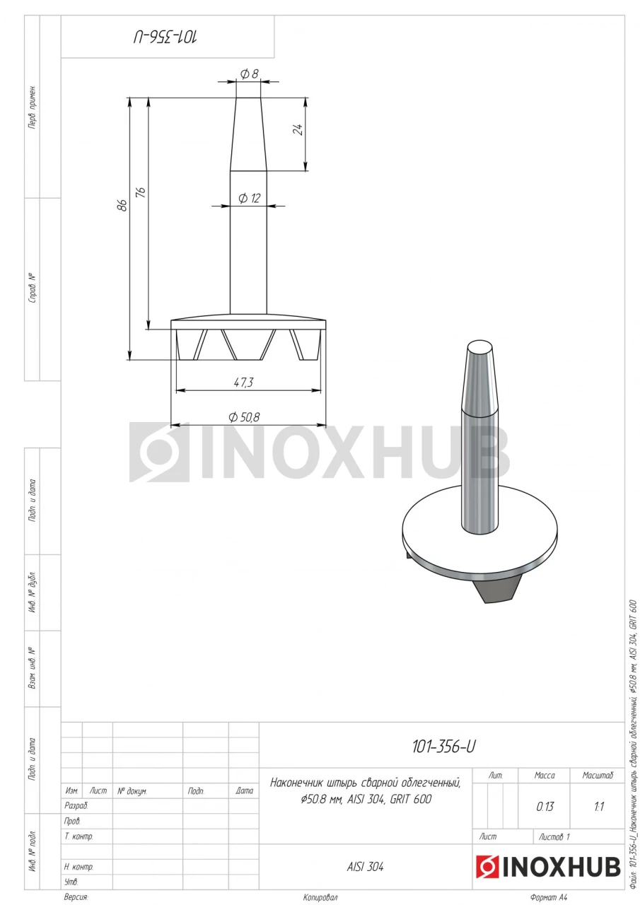 Наконечник штырь облегченный. Изготовлен из стали AISI 304. Полированная поверхность GRIT 600. Размер стойки — 50,8 мм. Поручень может иметь любой размер. Ложемент не предусмотрен.