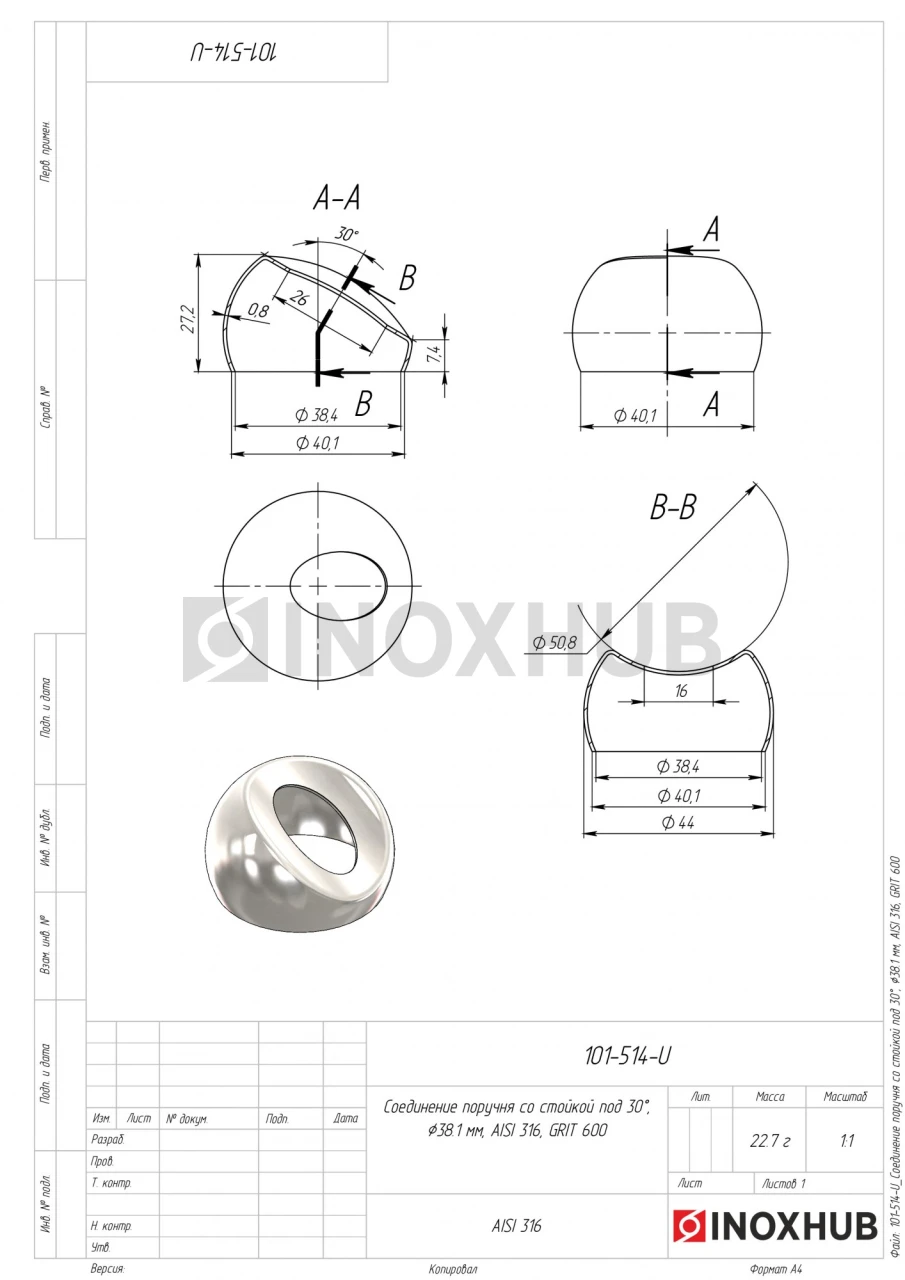 Соединение поручня со стойкой под 30°, Ø38.1 мм, AISI 316, GRIT 600