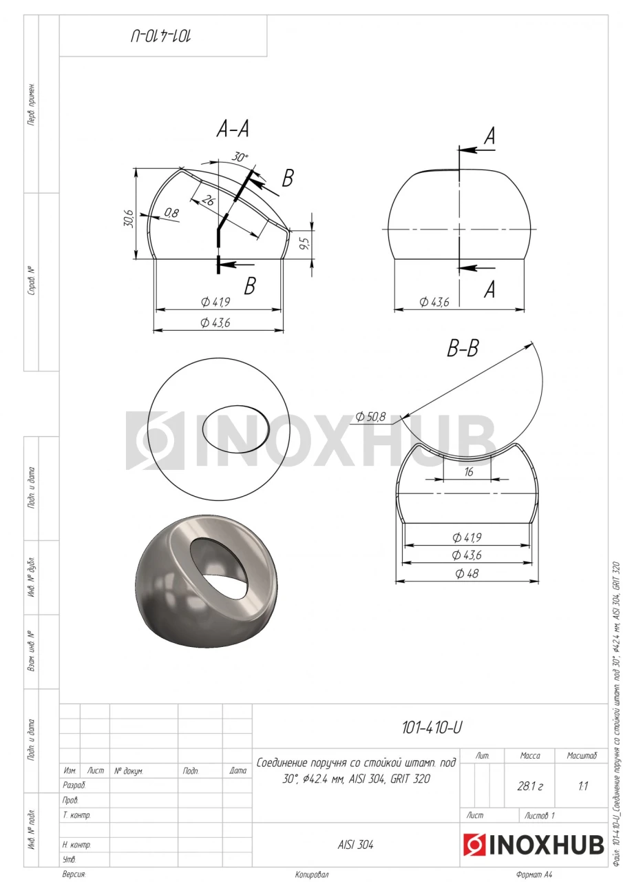 Соединение поручня со стойкой под 30°, Ø42.4 мм, AISI 304, GRIT 320