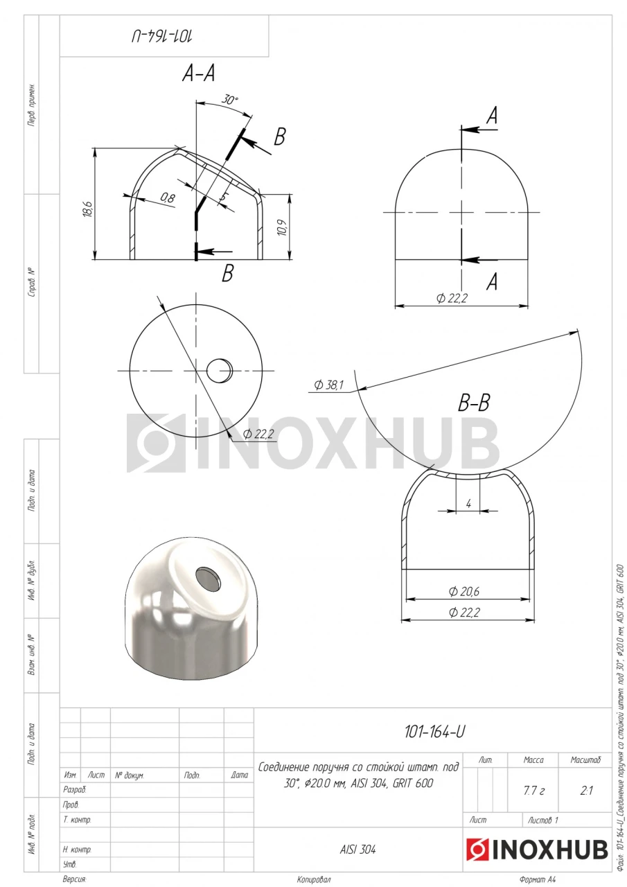 Соединение поручня со стойкой штамп. под 30°, Ø20.0 мм, AISI 304, GRIT 600