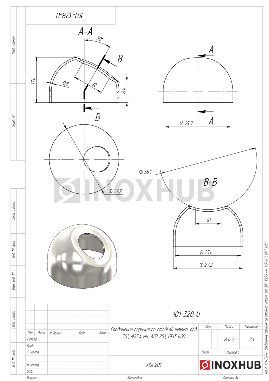 Штампованное соединение поручня со стойкой под 30°. Выполнено из стали AISI 201. Полированная поверхность GRIT 600. Предназначено для стойки диаметром 25,4 мм. Размер поручня — 50,8 мм. Ложемент под круглый поручень. Основные места использования — школьные и дошкольные учреждения.